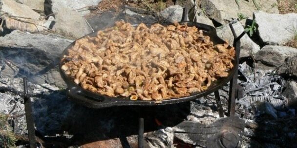 Liatinovú wok alebo paella panvicu rozpálime na ohni a pridáme slaninku, opražíme ju, pridáme olivy a šampiňóny a chvíľu ich spolu popražíme. Nastrúhame tvrdý údený syr – odporúčam ovčí.