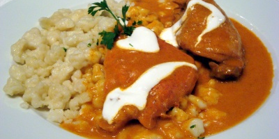 Cibuľu nakrájame, speníme, pridáme koreniny a lečo. Pridáme kuracie stehná, podlejeme vodou a dusíme do mäkka. Keď je kurča mäkké, rozhabarkujeme mlieko s vajciami, vlejeme k mäsu a všetko spolu ešte chvíľu povaríme. Hotové stehná podávame s haluškami poliate sýtou omáčkou a kyslú smotanu.