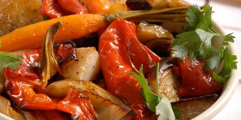 Cesnakový olej ochutíme mletým čiernym korením a sušeným oreganom. Ochuteným olejom prelejeme posolenú zeleninu, vložíme do vyhriatej rúry a zapečieme.