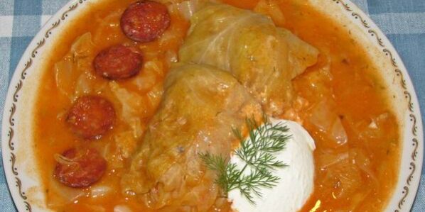 Listy hlávkovej kapusty scedíme a do každého voľne zabalíme guľku mäsovej hmoty. Takto pripravené batôžky poukladáme na šunkový základ, posypeme polovicou zvyšnej múky a papriky. Dochutíme aj malým množstvom muškátového orecha. Prikryjeme druhou tretinou kapusty.