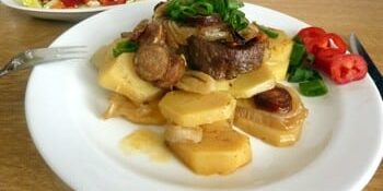 Ošúpané zemiaky nakrájame na kolieska, očistenú cibuľu na štvrtky, papriku na kocky. Pekáč vytrieme trochou oleja a na spodok rozložíme polovičné množstvo zemiakov. Osolíme a rozložíme plátky ochuteného mäsa. Zvyšnú časť zemiakov spolu s cibuľou, paprikou a očistenými celými strúčikmi cesnaku poukladáme na plátky mäsa. Posypeme rascou, pokvapkáme zvyšným olejom, prikryjeme alobalom a vo vyhriatej rúre pri teplote 200 °C zapekáme 40 minút.