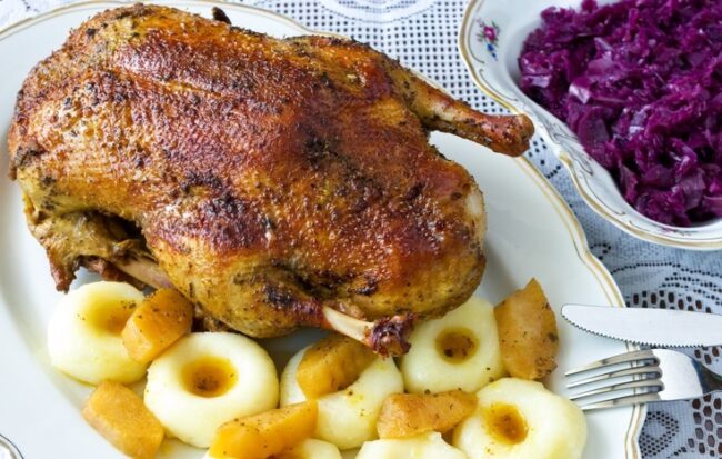 Pečená kačica s gaštanmi a omáčkou z červeného vína