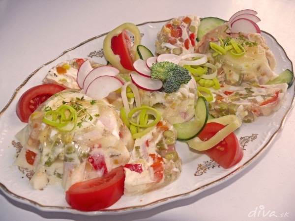 Suroviny: 2 fľaše sterilizovanej zmesi moravanka bez feferónok 250 ml majonézy 5 vajec 200 g šunkovej salámy 1 bujón 3 želatíny Postup receptu: Sterilizovanú zeleninu preceďte a vodu odložte na bok. Vajcia uvarte v slanej vode a pokrájajte na kocky, ktoré vložíte do väčšej misy ku zelenine. Pridajte do toho ešte na drobno pokrájanú salámu…