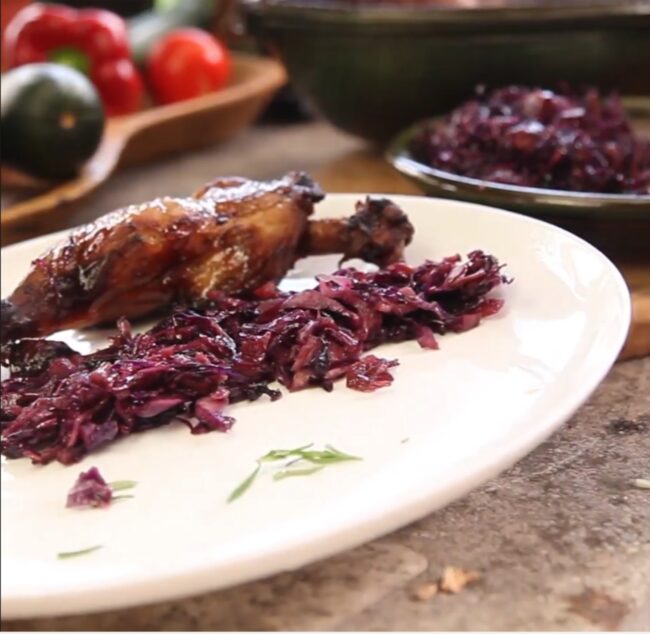 Pomaly pečené husacie stehno na jablkách s červenou kapustou