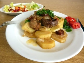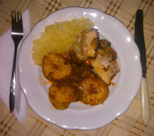 Príprava: Husacie stehná osolíme, posypeme čiernym korením a vložíme do pekáča. Dve jablká nakrájame na štvrtinky a spolu s očisteným cesnakom a nakrájanou cibuľou ukladáme k mäsu, prelejeme olejom a vložíme do horúcej peci alebo rúry, jedlo však môžeme pripraviť aj nad pahrebou. Po 30 – 40 minútach (podľa veľkosti stehien) odlejeme olej a pečieme na 180 – 200 stupňoch. Medzitým nakrájame…