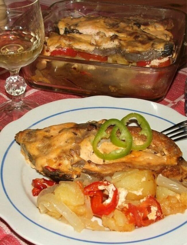 Postup: Na očistenej rybe urobíme hlboké zárezy (každých 4-5 centimetrov), osolíme a odložíme nabok. Zemiaky v šupke uvaríme v slanej vode na polomäkko (za 15-20 minút). Necháme trocha vychladnúť, ošúpeme a nakrájame na kolieska. Dno pekáča potrieme masťou (môžeme použiť aj olej alebo maslo, ale uberá to na chuti). Do pekáča ukladáme osolené kolieska zemiakov,…